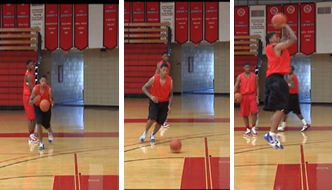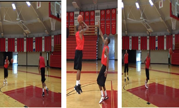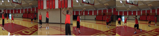 - pemain yang ke arah elbow menerima bola dan melakukan jump stop sebelum melakukan jump shoot. pemain yang dari base line berlari ke arah middle line