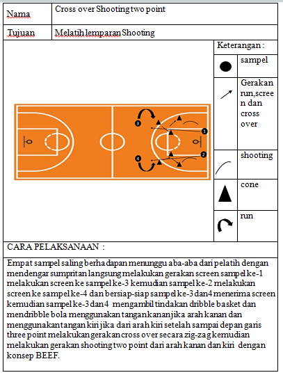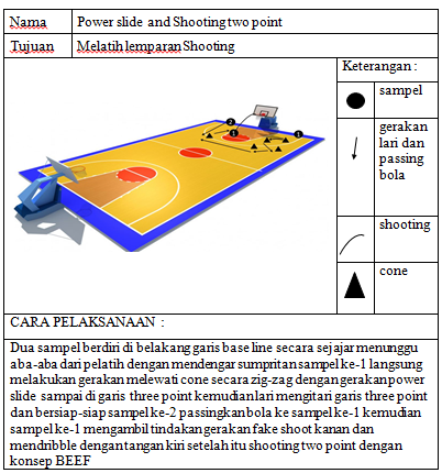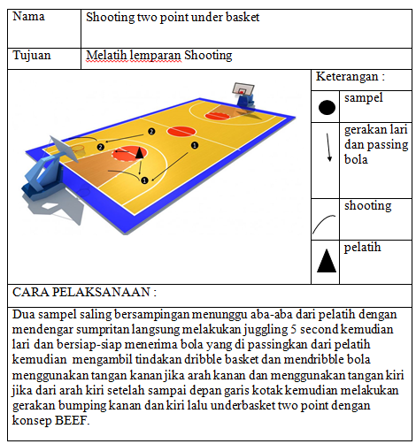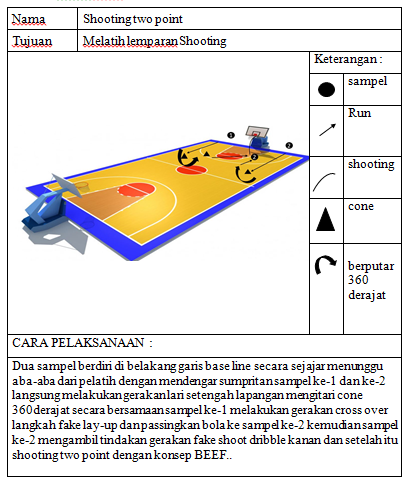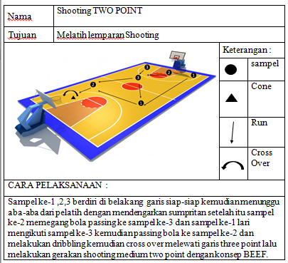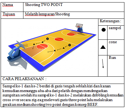 - Pemain pertama berada di 3point line middle dan pemain kedua berada di bawah ring memegang bola untuk mengoper ke pemain pertama