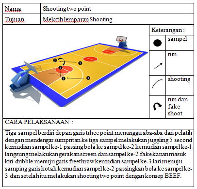 - pemain pertama menerima operan melakukan jump shoot di area medium atau midrange, pemain kedua berlari ke 3point line middle